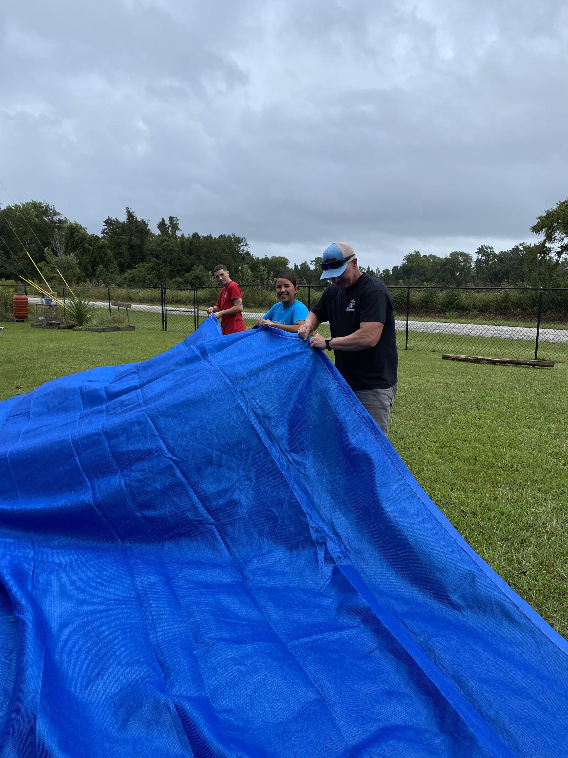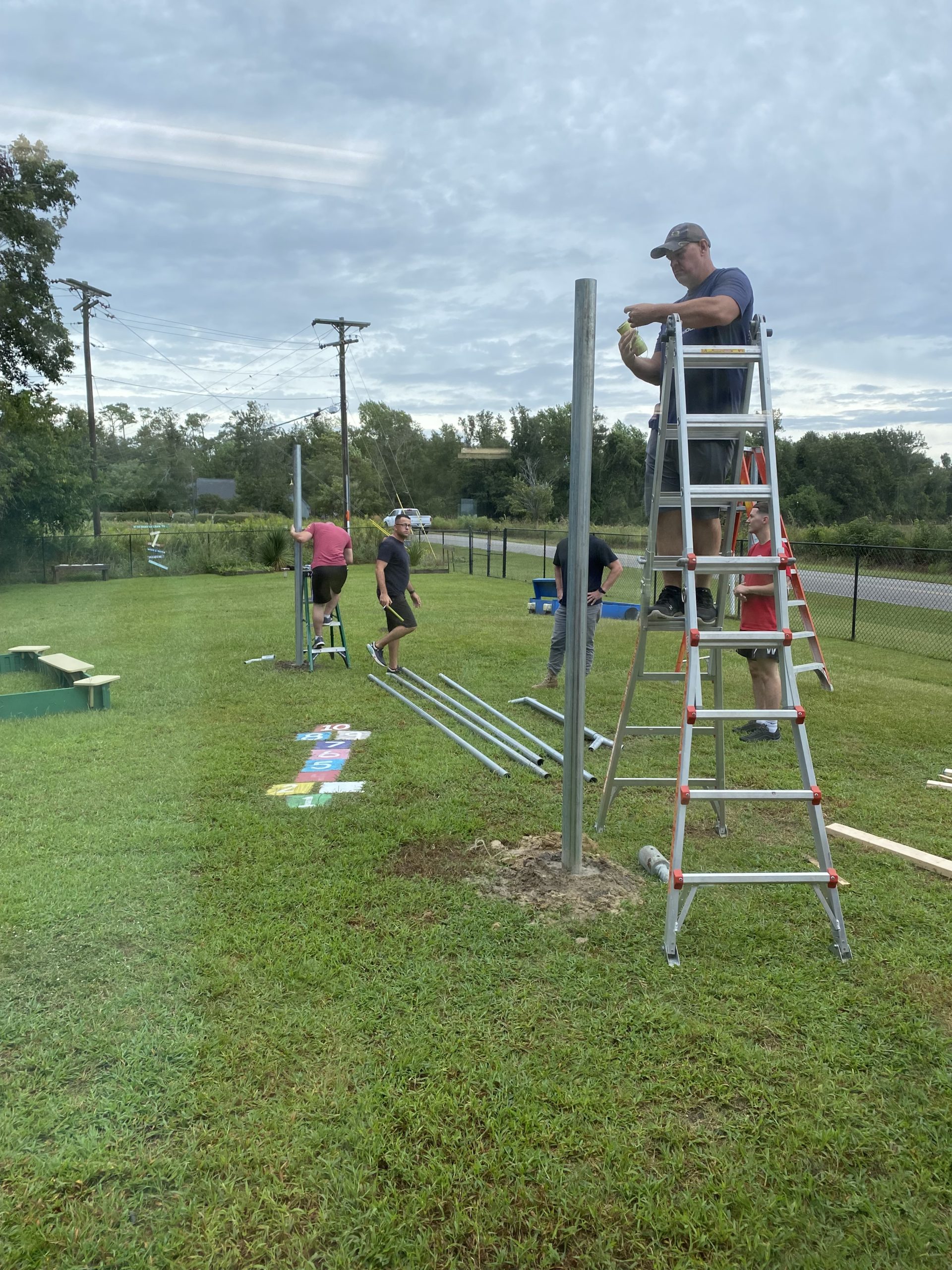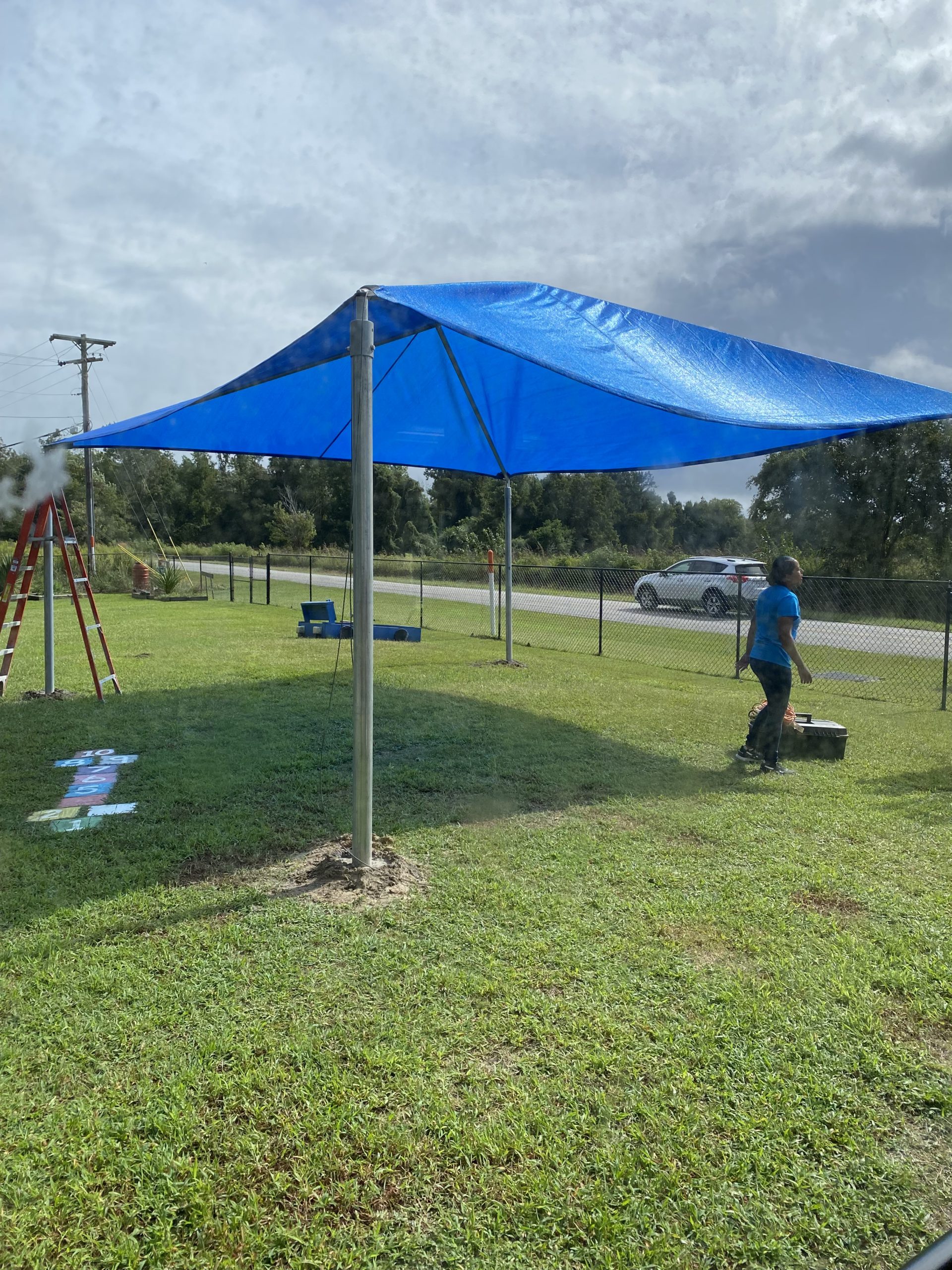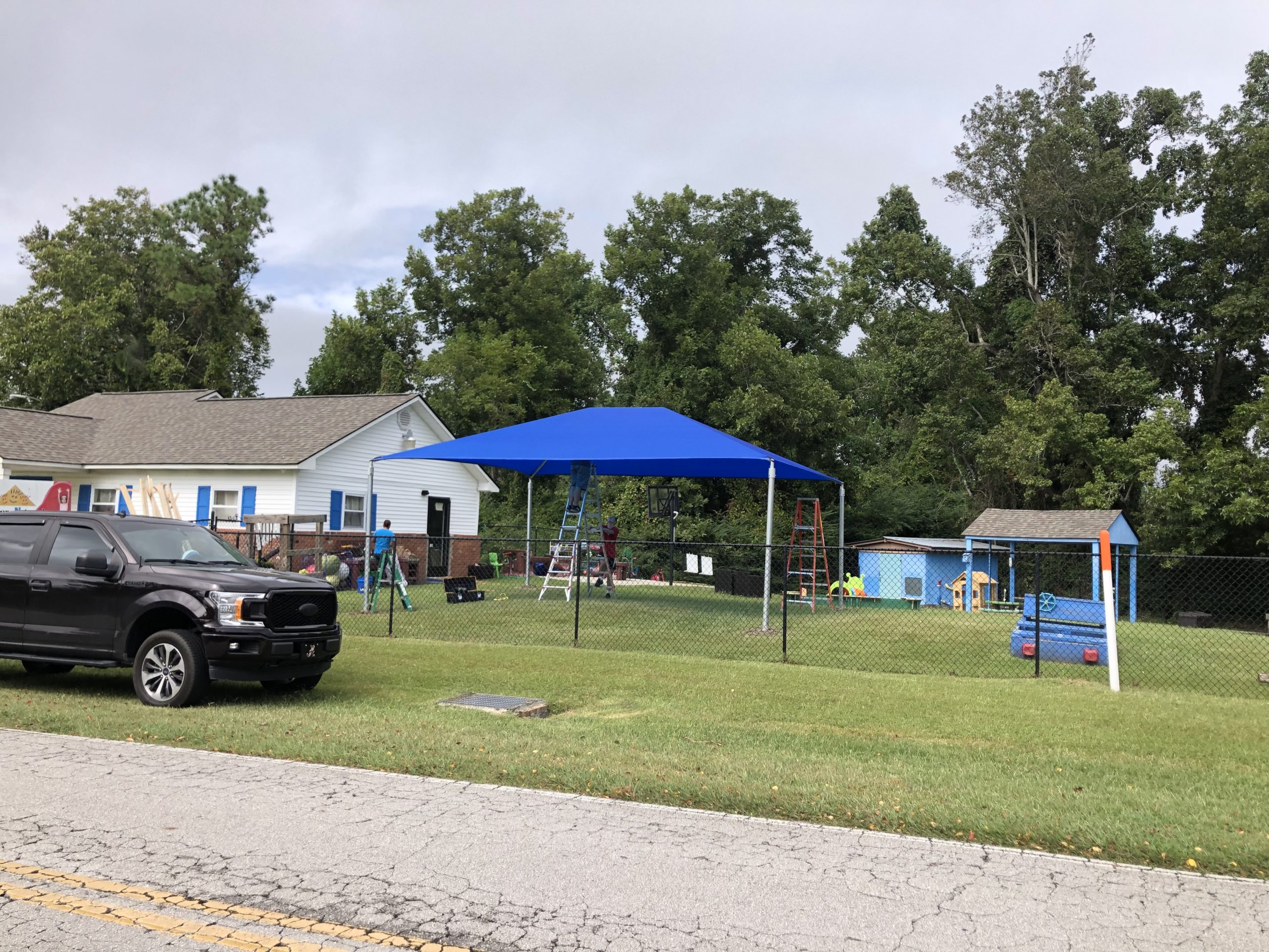 This week the center erected a 20×24 shade on the NC Pre-K playground to help provide the children with some refuge from the sun and a handful of Marines from the MALS 26 Unit aboard Marine Corps Air Station New River joined in to lend a hand.